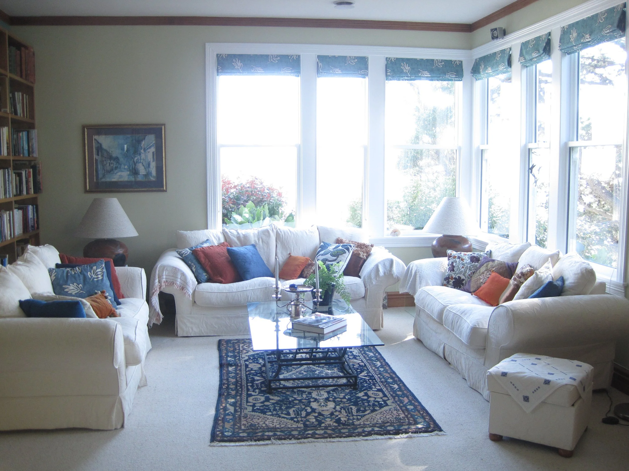Furniture was rearranged to improve flow and comfort, and two very comfortable armchairs (that were almost replaced because Jane thought they were too big) worked perfectly in their window nook once we got them feeling more balanced with a rug and side tables.
